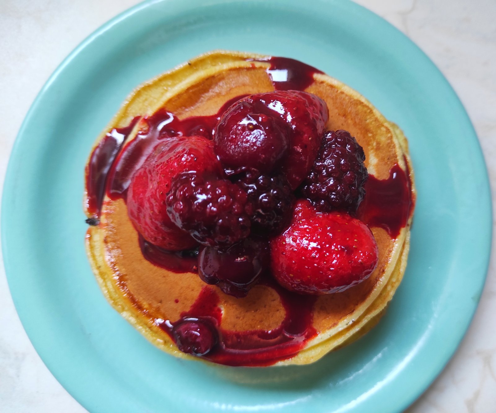 Poached eggs, apple pie, avocado toast, pancakes with honey and sesame spread tahini
